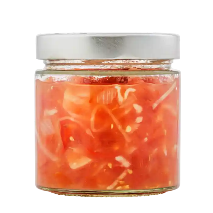 Årstidernas fräscha och syrliga tomatsalsa med lök och vitkål smaksatt med chili, vitlök och limesaft. Fermenterad i cirka 2 veckor under uppsyn av våra kockar.