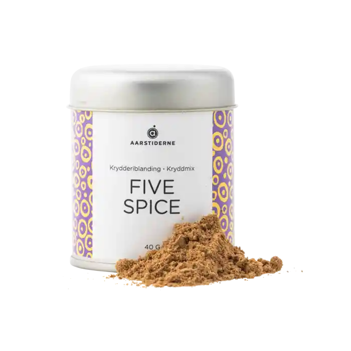Five spice är en klassisk krydda i det kinesiska köket. Som namnet indikerar, är det en blandning av fem kryddor: stjärnanis, sichuanpeppar, fänkål, kanel och nejlika. Dessa kryddor är alla markanta i smaken och balansen är därför viktig i sammansättningen av dem.