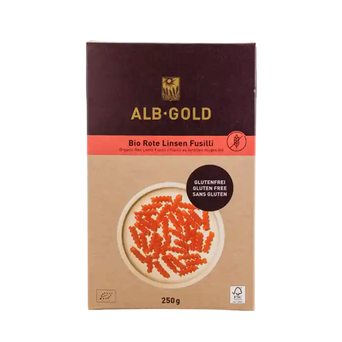 Ekologisk glutenfri pasta fusili med rött linsmjöl, från ALB GOLD, 250 g.