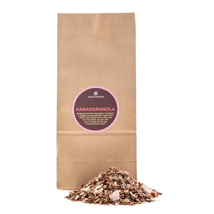 Årstidernas granola är utvecklad och avsmakad av våra kockar. Den krispiga granolan är smaksatt med vanilj och kakao. Den innehåller rostade havregryn, rågflingor, hasselnötter och dadlar.