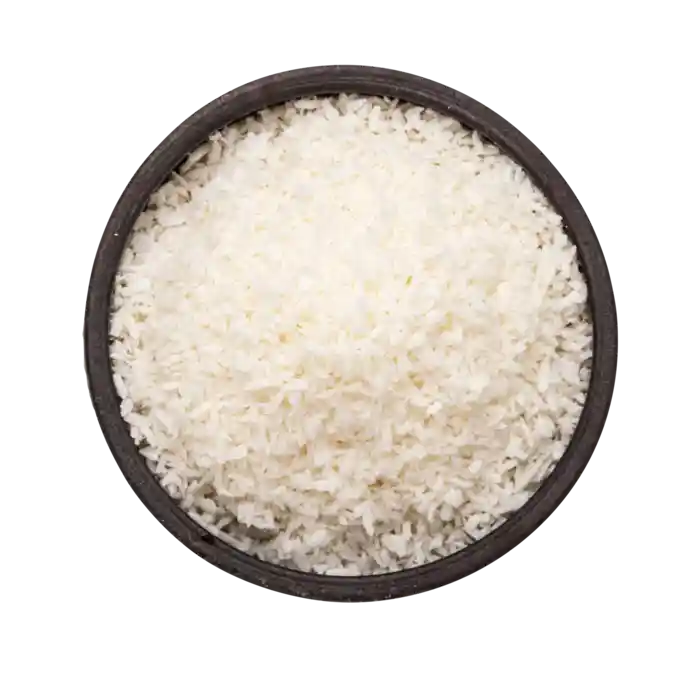 Riven kokos görs av den vita delen av kokosnöten som har torkats och malts.