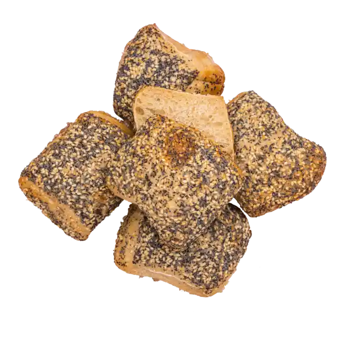 Frukostfrallor bakade på surdeg och toppade med blå vallmofrön, solroskärnor och sesamfrön.