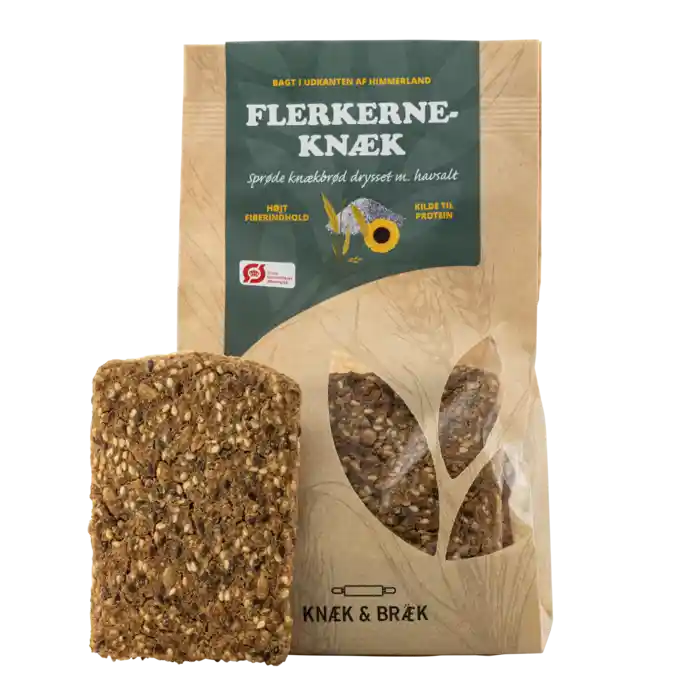 Knæk & Bræk är ett litet lokalt bageri i Øster Doense i Himmerland, Danmark. Bageriet startades av fyra vänner med en passion för kvalitet och hållbarhet. Deras knäckebröd tillverkas enligt traditionella metoder av dansk råg och havre.