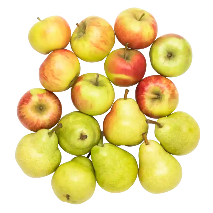Ekologiska äpplen och päron, minst 1,9 kg. Sorterna varierar efter säsong, noga utvalda efter smak och konsistens.