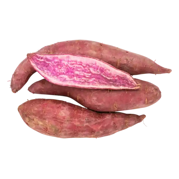 Den lila varianten av den vanliga orangea sötpotatisen. Färgen på den lila sötpotatisen kommer från antocyaniner – samma färgämnen som du hittar i rödkål och hallon.