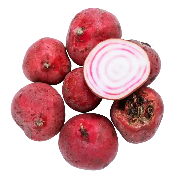De randiga rödbetorna kallas polkabetor, på grund av deras vackra vit- och rödrandiga inre, som påminner lite om en polkagris.