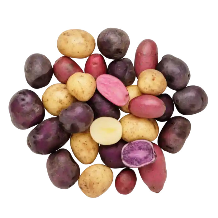 En vacker färgmix av 3–4 olika potatissorter. Du kan bland annat få Heiderot, Blå Congo, Alouette eller en gul typ som till exempel Folva eller Gala.