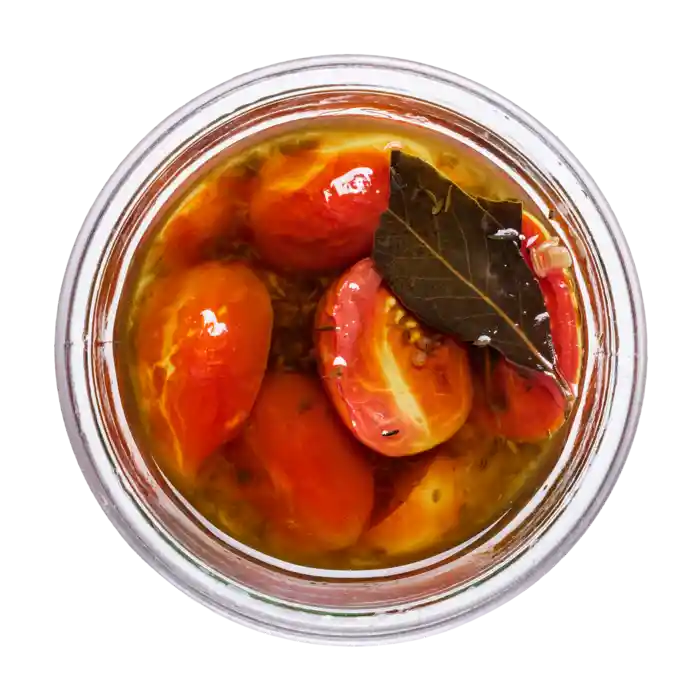 Confiterade tomater gjorda på solmogna tomater som tillagas långsamt i olja på låg värme med vitlök, kryddor och lagerblad. Det ger en djup och rund tomatsmak med naturlig sötma, balanserad med en touch vit balsamvinäger.