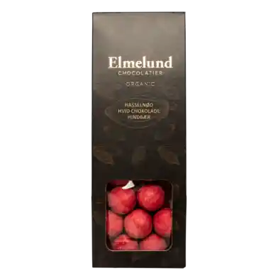 90 g | Dragerade hasselnötter med vit choklad och frystorkade hallon