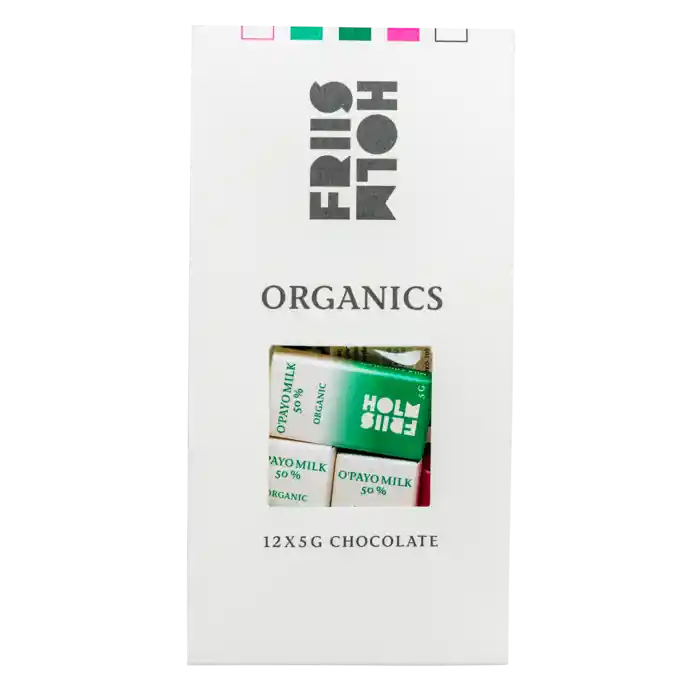12 ekologiska små praliner från Friis-Holm Choklad, 12 x 5 g.