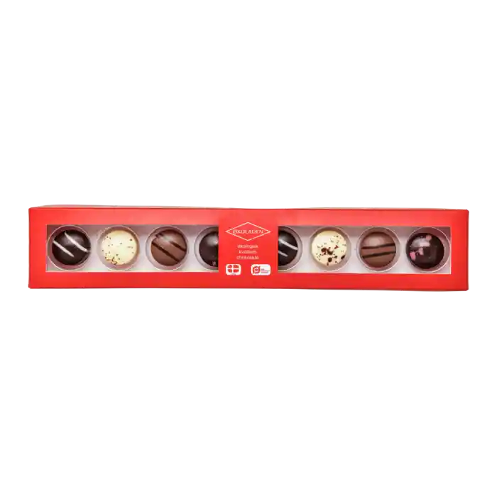 Fyllda chokladpraliner med smak av hallon, nougat, whiskey och pepparmint.