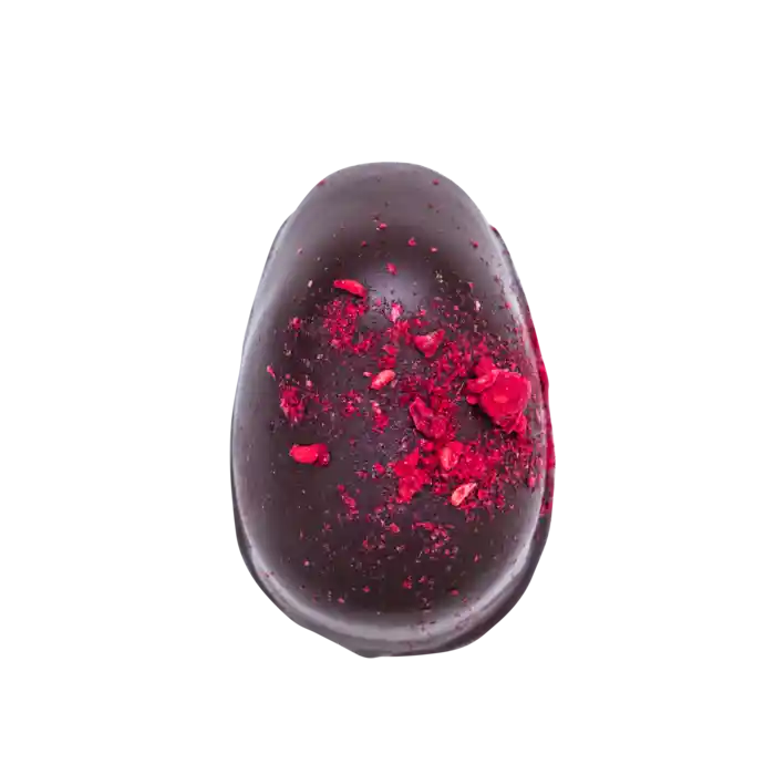 Ett enkelt men otroligt gott marsipanägg överdraget med 70 procent mörk choklad och dekorerat med frystorkade hallon.
