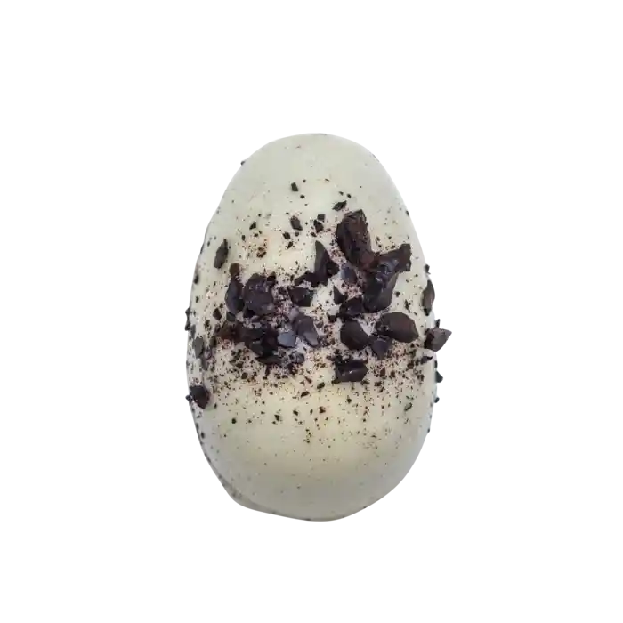Ett gott marsipanägg överdraget med vit choklad och dekorerat med krossad rålakrits. Marsipanen är gjord genom att blanda lakritspulver och lakritslikör i den mjuka marsipanen, vilket ger en intensiv och genomträngande lakritssmak. Den vita chokladen kompletterar lakritssmaken perfekt och binder samman hela smakupplevelsen till ett harmoniskt och oemotståndligt marsipanägg.