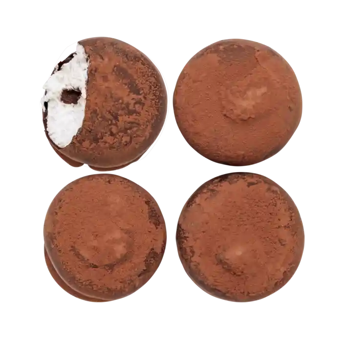 Handgjorda skumtoppar med vaniljskum, karamell och marsipanbotten doppad i 70% mörk choklad och strösslad med kakao.