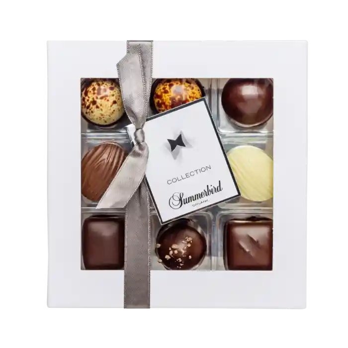 En fin gåvoask med 9 varianter av Summerbirds fyllda chokladpraliner