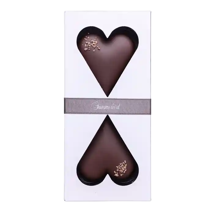 Två hjärtan av marsipan, gjorda på stenvalsade medelhavsmandlar, överdragna med ett tjockt lager mörk Amazonas 61%-choklad, strödda med lättrostade krossade kakaobönor.