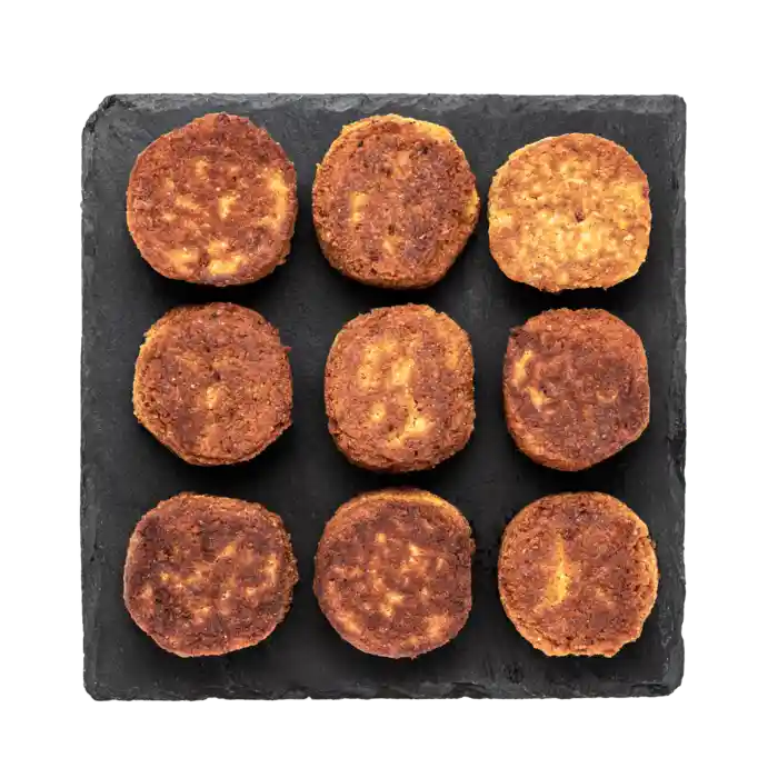 Stekt falafel gjord på kikärtor som har blandats med varma kryddor och sötpotatis. Falafelfärsen har formats till falafelbollar och sedan stekts så de är redo att serveras.