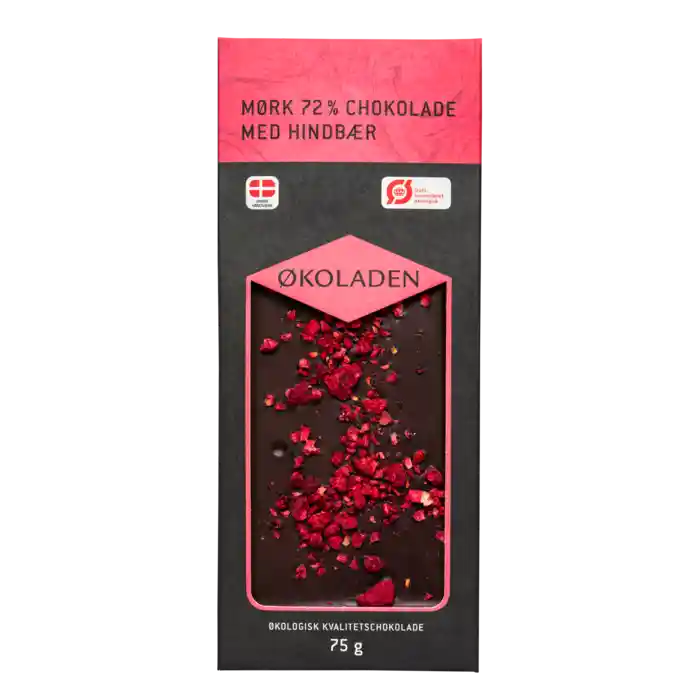 Ekologisk mörk choklad (72%) med frystorkade hallon från Økoladen, 75 g.