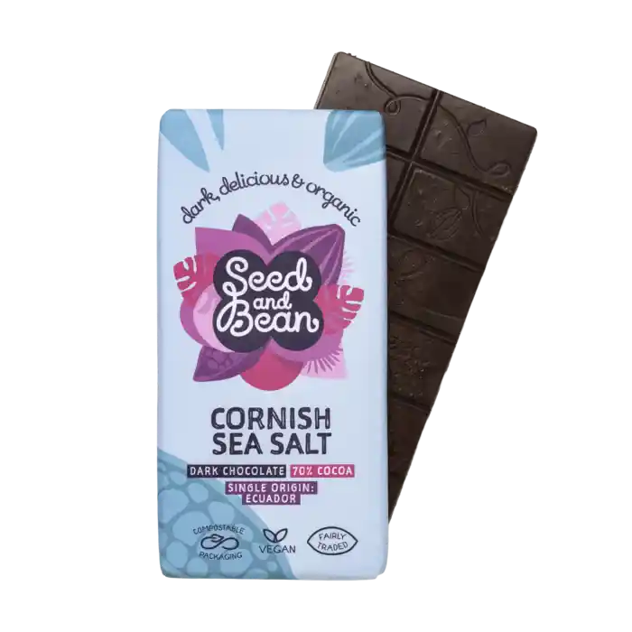 Ekologisk mörk choklad (70%) med havssalt från Seed and Bean, 85 g. Vegansk.