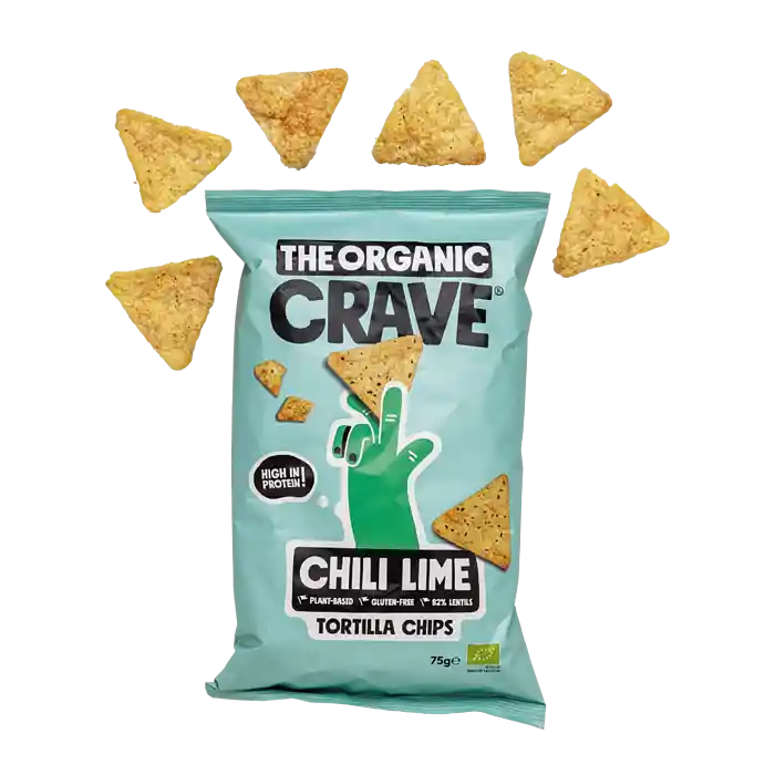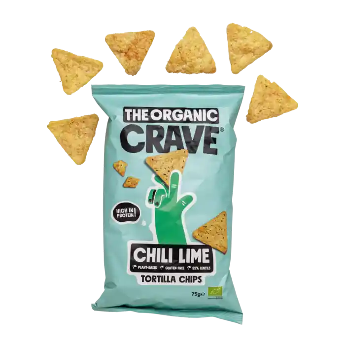 Ekologiska lins-tortillachips med chili- och limesmak från The Organic Crave, 75 g.